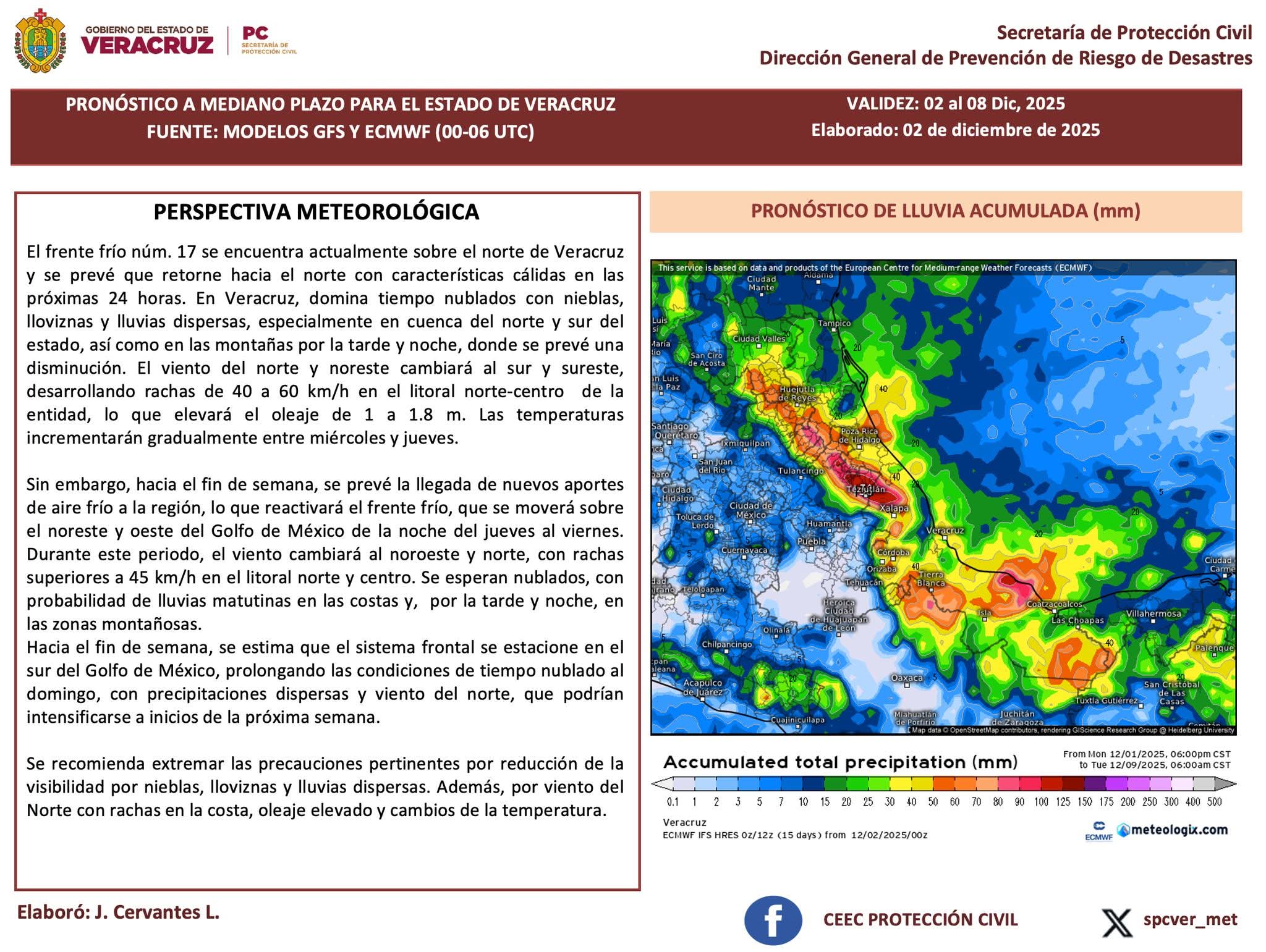 Hacia el fin de semana, se estima que el sistema frontal se estacione en el sur del Golfo de México, extendiendo las condiciones de tiempo nublado al domingo, con precipitaciones dispersas y viento del norte, que podrían intensificarse a inicios de la próxima semana.