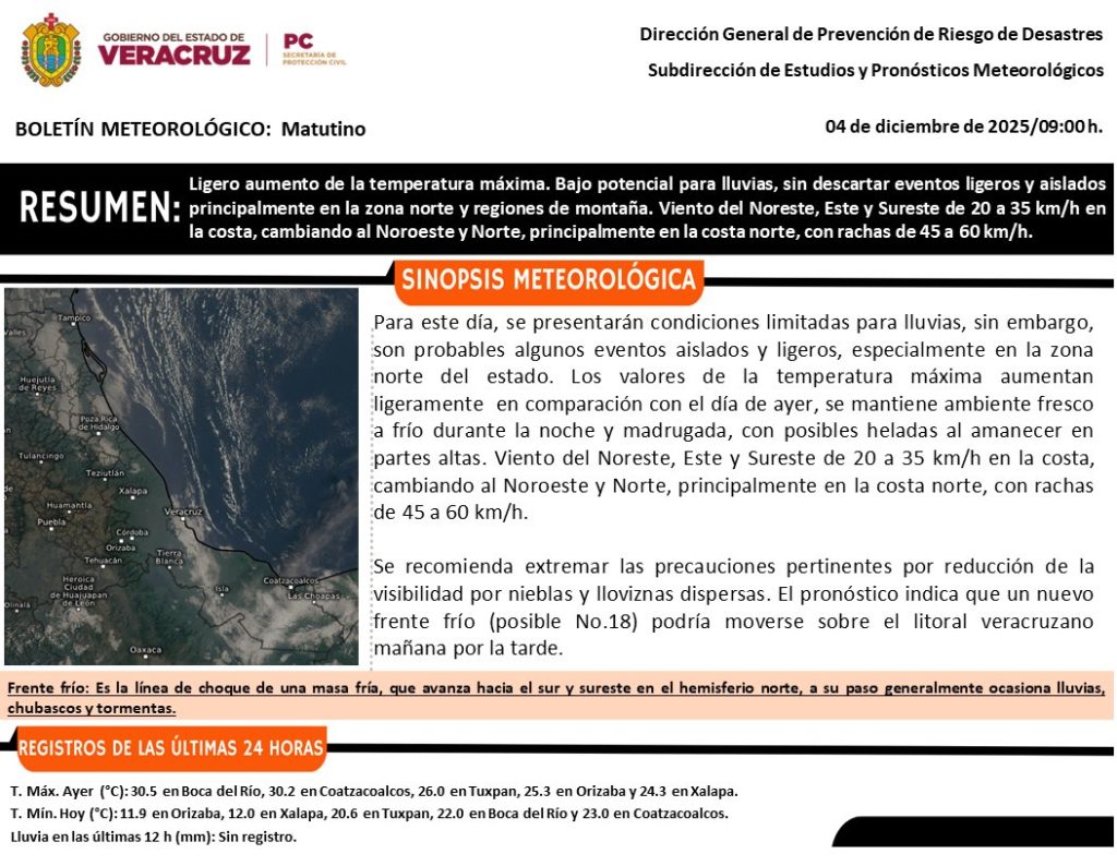 Rachas de hasta 60 kilómetros por hora este viernes, por frente frío #18; probables lluvias para el sábado
