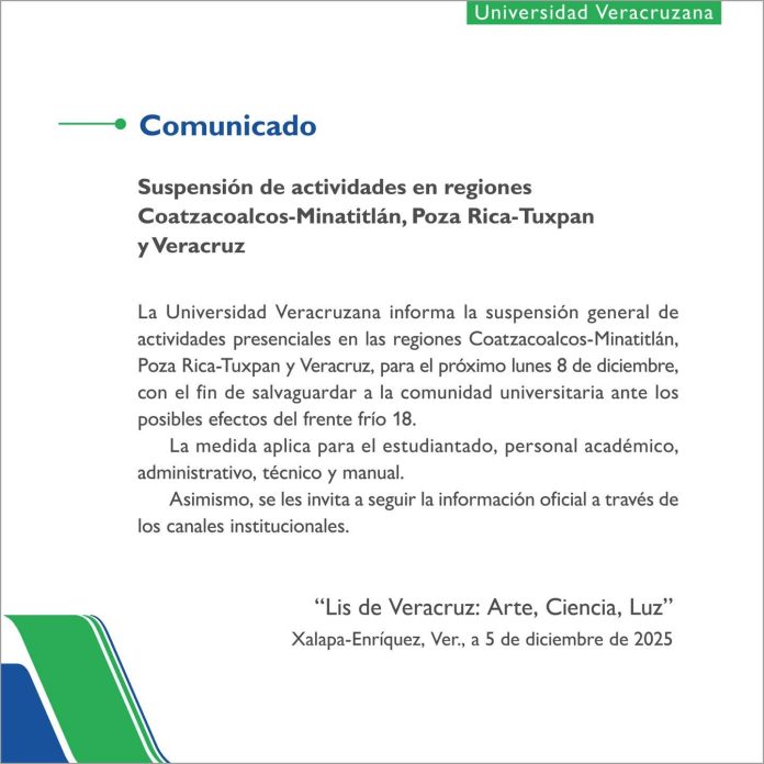 Por frente frío, UV suspende clases el lunes diciembre 5, 2025 FacebookTwitterWhatsAppTelegram Como medida preventiva ante los efectos del frente frío 19, la Universidad Veracruzana informa la suspensión de actividades en las regiones Coatzacoalcos-Minatitlán, Poza Rica-Tuxpan y Veracruz, para el lunes 8 de diciembre de 2025.
