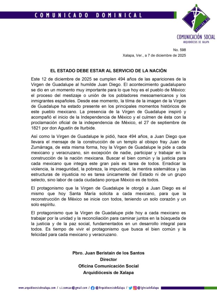 El Estado debe estar al servicio de la Nación: Arquidiócesis de Xalapa diciembre 7, 2025 FacebookTwitterWhatsAppTelegram