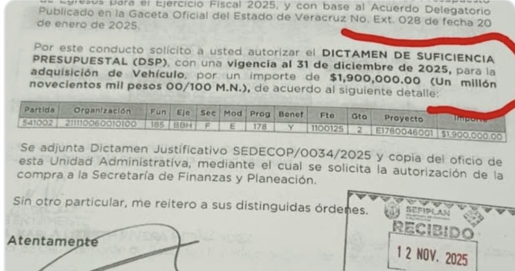 Xalapa, Ver., miércoles 10 de diciembre de 2025.- Ante información difundida en redes sociales respecto a un oficio de solicitud para una posible adquisición de vehículo, el Gobierno del Estado informa a la ciudadanía que esta propuesta fue rechazada y por lo tanto la compra no se realizó.