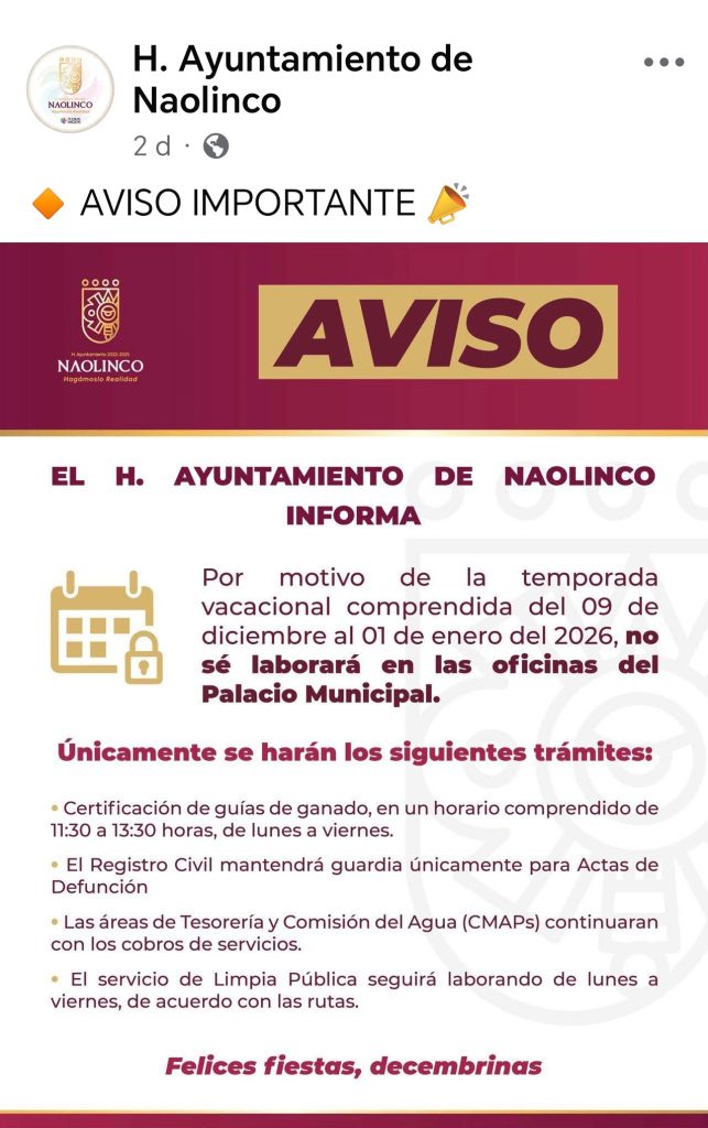 Sólo habrá guardias en oficina de certificación de ganado, Registro Civil sólo para actas de defunción, Tesorería y Comisión del Agua y el servicio de limpia pública se seguirá prestando de manera normal.