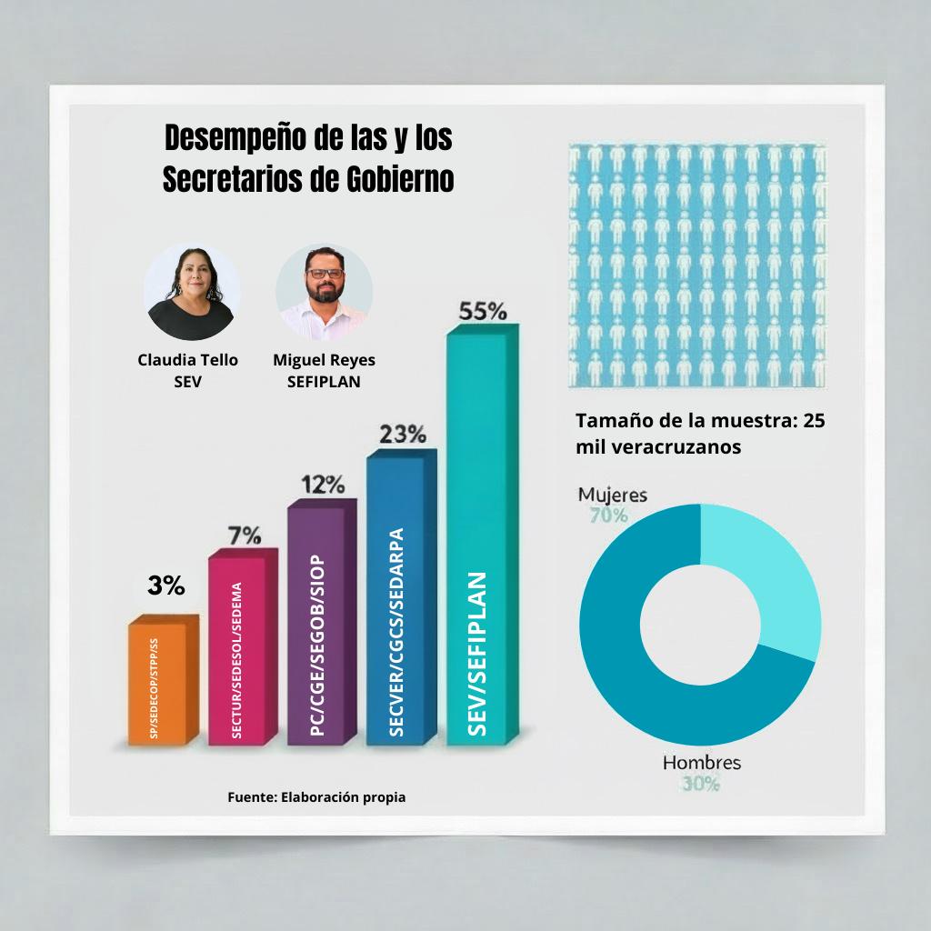 La Secretaría de Educación de Veracruz que preside Claudia Tello Espinosa y la Secretaría de Finanzas y Planeación que encabeza Miguel Reyes Hernández “destacan por mantener orden administrativo, continuidad operativa y resultados visibles, lo que les otorga la mayor confianza ciudadana”, indica la encuesta de opinión pública realizada entre población adulta, mayor de 18 años, con 25 mil entrevistas efectivas.