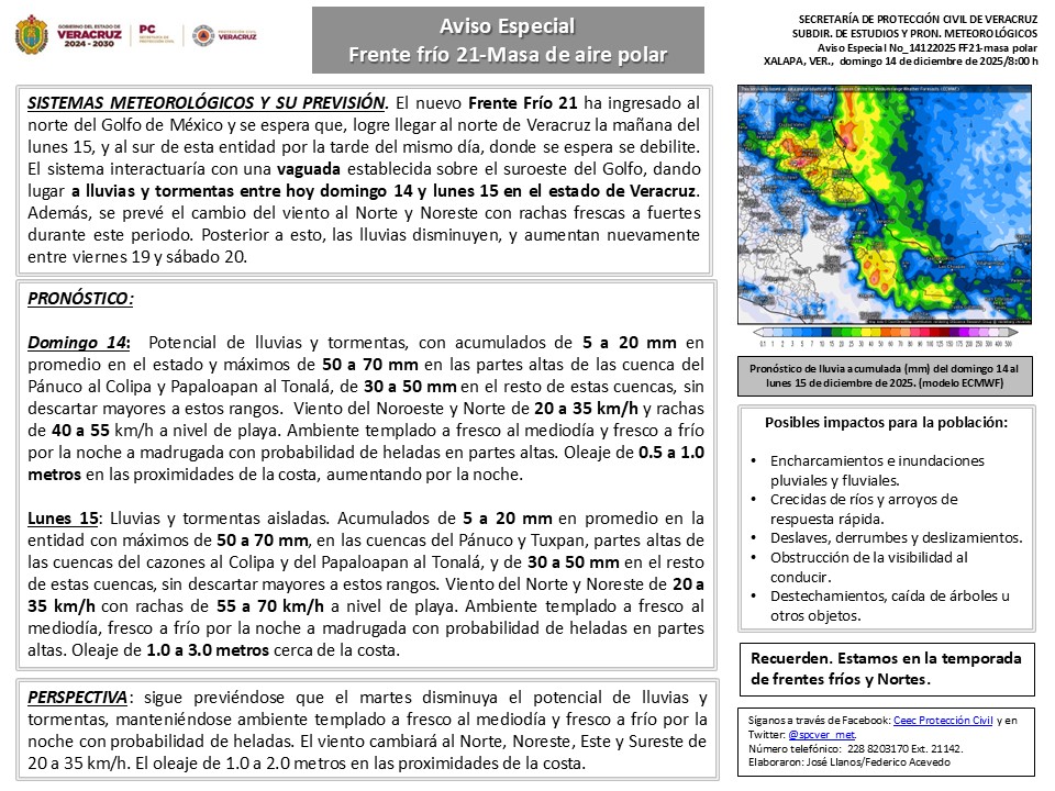 Frente frío #21 provocará rachas de viento de hasta 70 kilómetros este lunes, en zonas costeras de Veracruz diciembre 14, 2025 FacebookTwitterWhatsAppTelegram