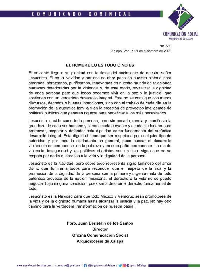 La verdadera transformación es alcanzar la justicia y la paz en nuestra Patria: Arquidiócesis de Xalapa diciembre 21, 2025 FacebookTwitterWhatsAppTelegram