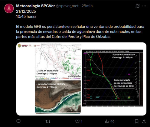 La Secretaría de Protección Civil del Gobierno del Estado de Veracruz pronostica que podrían registrarse nevadas o caída de aguanieve durante la noche de este domingo 21 de diciembre.