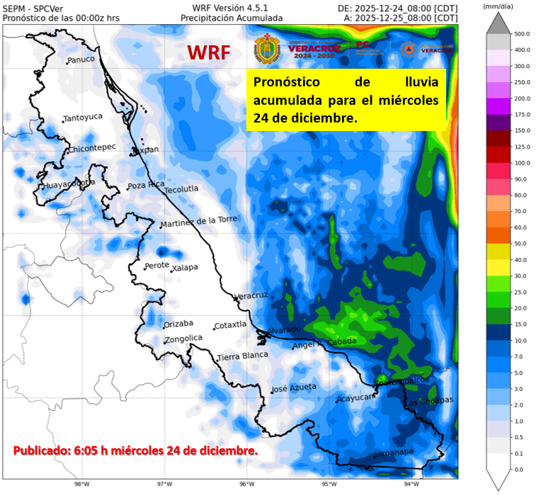 Por vaguada, lluvias se concentrarán aún más en el sur del estado de Veracruz, este miércoles diciembre 24, 2025 FacebookTwitterWhatsAppTelegram La secretaría de Protección Civil del gobierno del estado de Veracruz informa que se espera que la probabilidad mayor de lluvias fuertes se concentre este miércoles en el extremo sur de nuestro estado.
