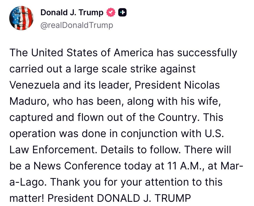 «Estados Unidos de América ha llevado a cabo con éxito un ataque a gran escala contra Venezuela y su líder, el presidente Nicolás Maduro, quien ha sido capturado junto con su esposa y trasladado fuera del país. Esta operación se realizó en coordinación con las fuerzas de seguridad de Estados Unidos. Más detalles serán anunciados posteriormente. Habrá una conferencia de prensa hoy a las 11:00 a. m. en Mar-a-Lago. ¡Gracias por su atención a este asunto! Presidente DONALD J. TRUMP».