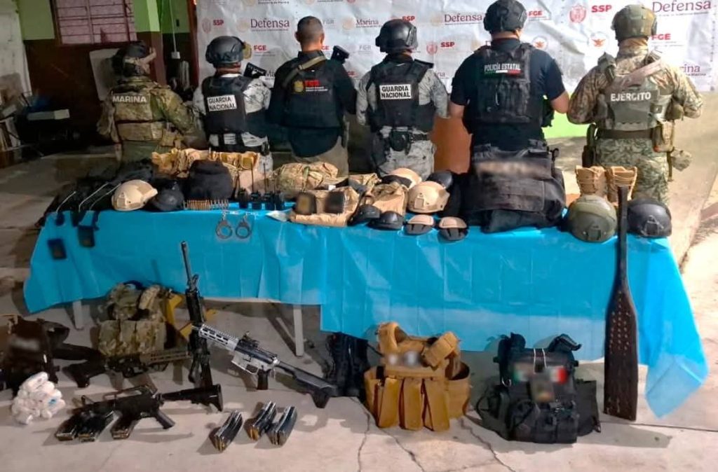 Precisó en una tarjeta informativa que elementos de Guardia Nacional, Ejército Mexicano, Secretaría de Marina, Fiscalía y Policía Estatal catearon un inmueble empleado como helipuerto, detuvieron a una persona, aseguraron tres armas cortas, tres cargadores, 45 cartuchos, seis aeronaves de ala rotativa, una aeronave de ala fija, un fuselaje y un vehículo.