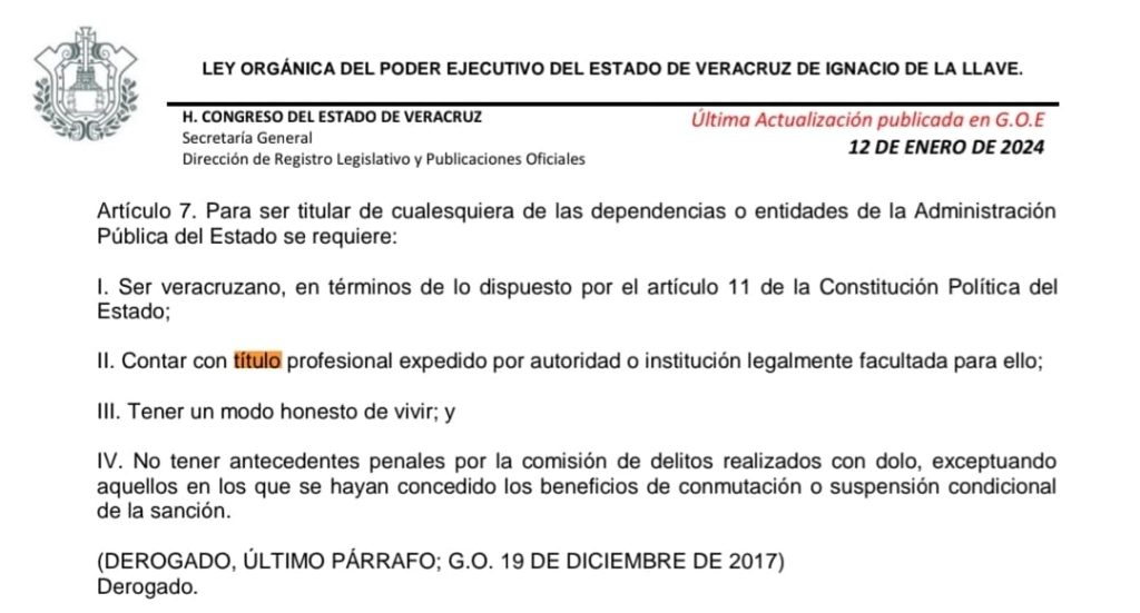 Además, la ley Orgánica del Poder Ejecutivo dice que para ocupar una jefatura y de ahí para arriba, debe tener Cédula Profesional.