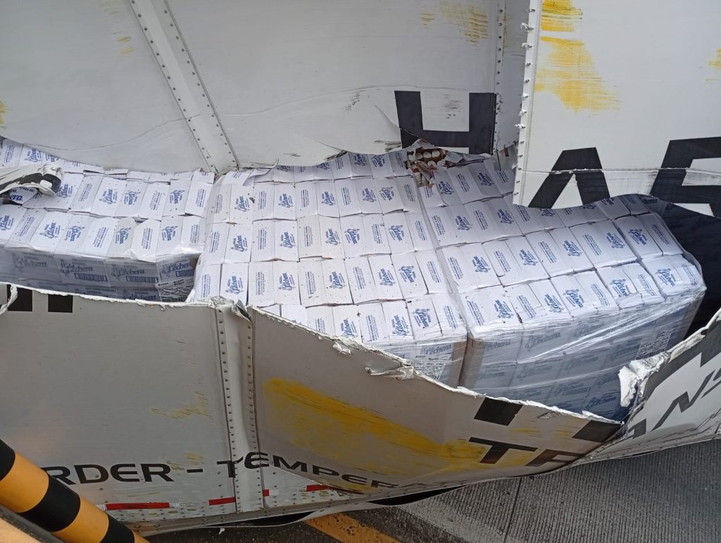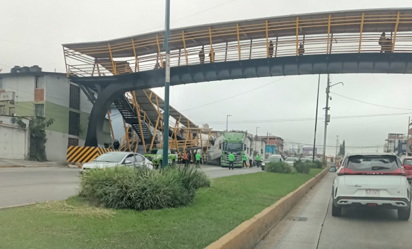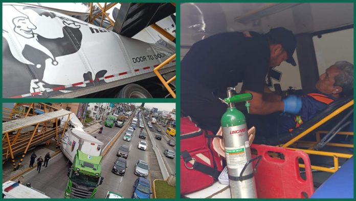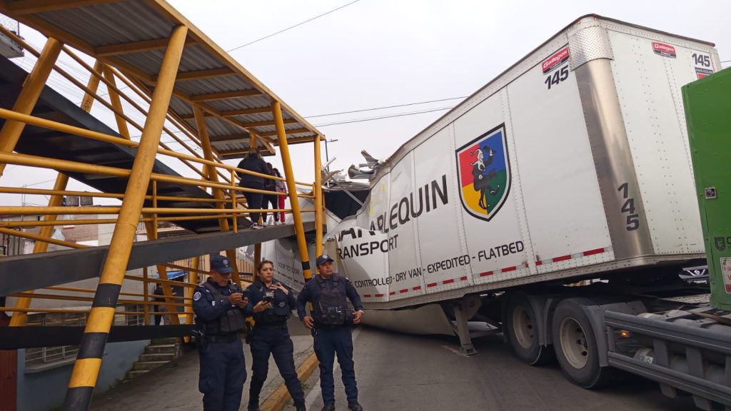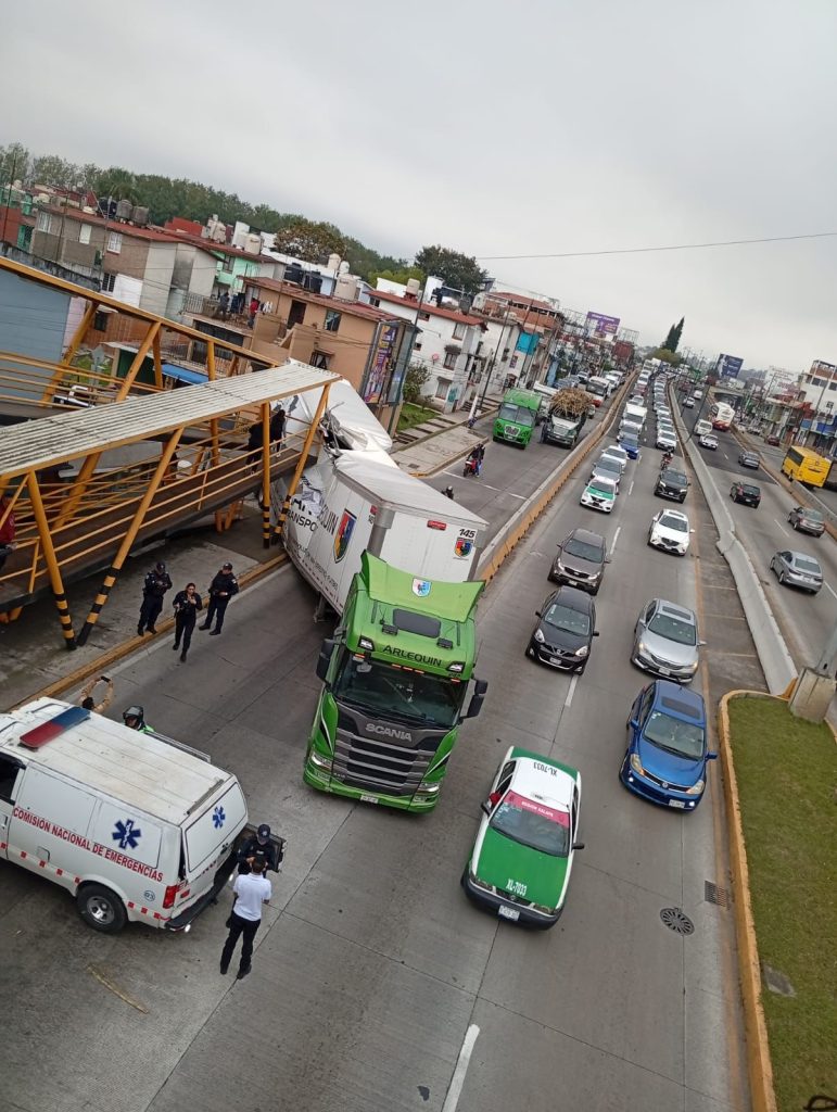Debido a que la maniobra fue mal realizada, la segunda caja se impactó contra el puente peatonal donde quedó atorada y abierta de su parte frontal derecha.