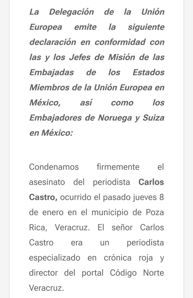En un comunicado, la Unión Europea y los embajadores de Suiza y Noriega condenaron el asesinato del reportero Carlos Castro, hecho ocurrido el 8 de enero de este año en Poza Rica.