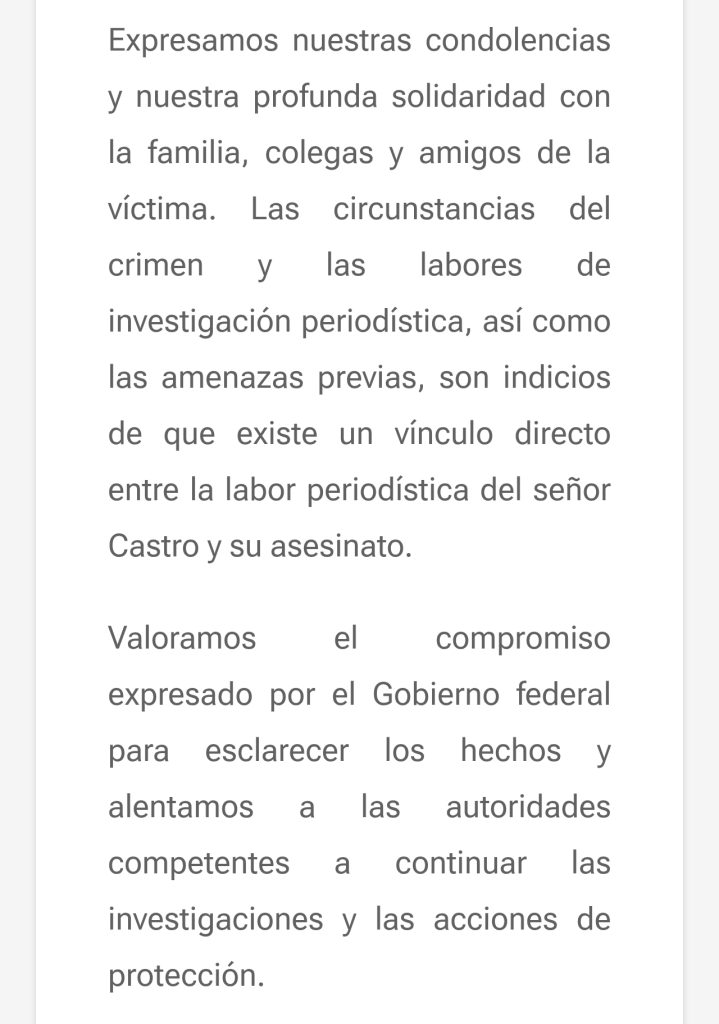 Expresamos nuestras condolencias y nuestra profunda solidaridad con la familia, colegas y amigos de la víctima. Las circunstancias del crimen y las labores de investigación periodística, así como las amenazas previas, son indicios de que existe un vínculo directo entre la labor periodística del señor Castro y su asesinato.