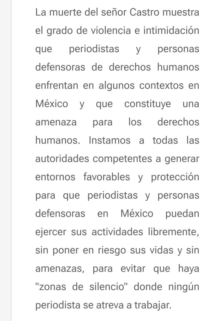 La muerte del señor Castro muestra el grado de violencia e intimidación que periodistas y personas defensoras de derechos humanos enfrentan en algunos contextos en México y que constituye una amenaza para los derechos humanos. Instamos a todas las autoridades competentes a generar entornos favorables y protección para que periodistas y personas defensoras en México puedan ejercer sus actividades libremente, sin poner en riesgo sus vidas y sin amenazas, para evitar que haya «zonas de silencio» donde ningún periodista se atreva a trabajar.