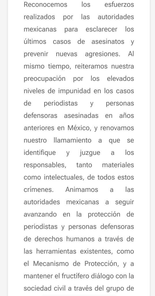 Reconocemos los esfuerzos realizados por las autoridades mexicanas para esclarecer los últimos casos de asesinatos y prevenir nuevas agresiones. Al mismo tiempo, reiteramos nuestra preocupación por los elevados niveles de impunidad en los casos de periodistas y personas defensoras asesinadas en años anteriores en México, y renovamos nuestro llamamiento a que se identifique y juzgue a los responsables, tanto materiales como intelectuales, de todos estos crímenes. Animamos a las autoridades mexicanas a seguir avanzando en la protección de periodistas y personas defensoras de derechos humanos a través de las herramientas existentes, como el Mecanismo de Protección, y a mantener el fructífero diálogo con la sociedad civil a través del grupo de trabajo creado para su mejora.