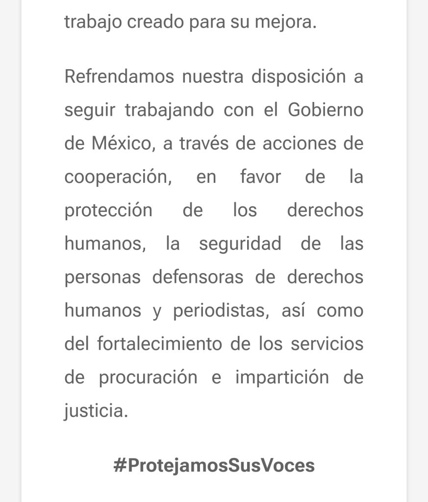 Refrendamos nuestra disposición a seguir trabajando con el Gobierno de México, a través de acciones de cooperación, en favor de la protección de los derechos humanos, la seguridad de las personas defensoras de derechos humanos y periodistas, así como del fortalecimiento de los servicios de procuración e impartición de justicia.