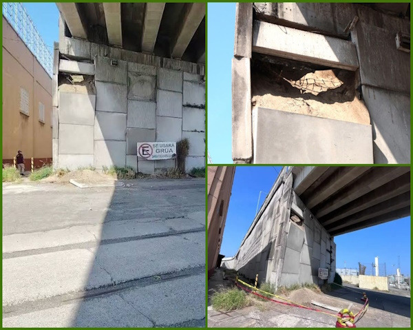 Para el ingeniero Hernández Ruiz, las partes más dañadas del puente son las columnas que se encuentran al norte de la terminal de ferrocarriles, filtraciones en juntas de construcción y desprendimientos con corrosión en el acero de refuerzo en barandales, aleros y banquetas, por lo que estas últimas se constituyen en un peligro sí imprudentemente un vehículo toma esta vía para circular.