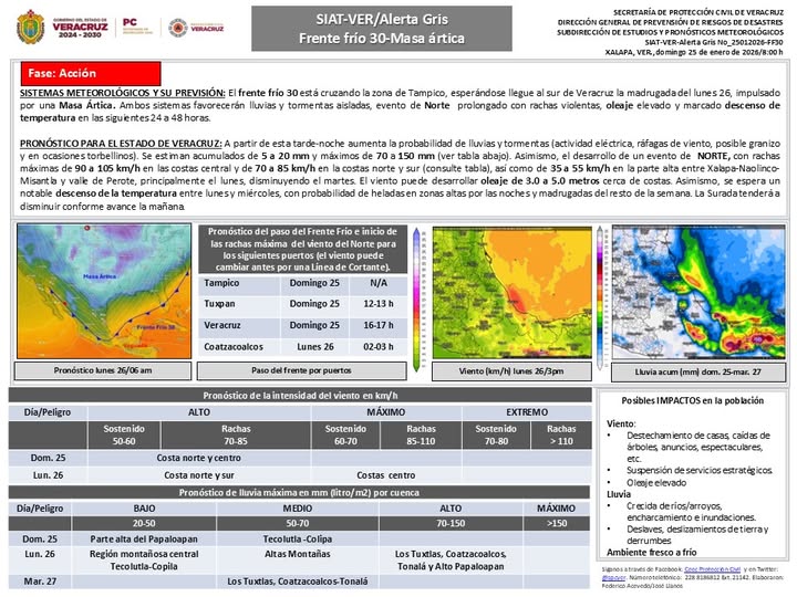 SISTEMAS METEOROLÓGICOS Y SU PREVISIÓN: El frente frío 30 está cruzando la zona de Tampico, esperándose llegue al sur de Veracruz la madrugada del lunes 26, impulsado por una Masa Ártica. Ambos sistemas favorecerán lluvias y tormentas aisladas, evento de Norte prolongado con rachas violentas, oleaje elevado y marcado descenso de temperatura en las siguiente 24 a 48 horas..