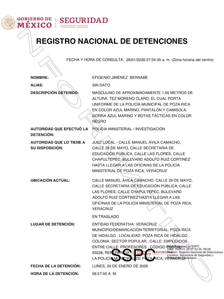 A través del Sistema Nacional de Detenciones, se señala que el detenido fue identificado como EFIGENIO J. B., quien se desempeñó como ex comisario de la Policía Municipal de Poza Rica, y fue asegurado al interior de las oficinas de la Policía Municipal, ubicadas en la colonia Sector Popular de esta petrolera ciudad.