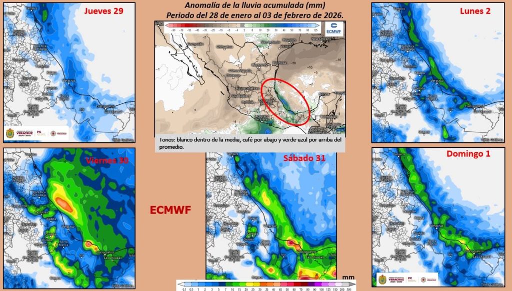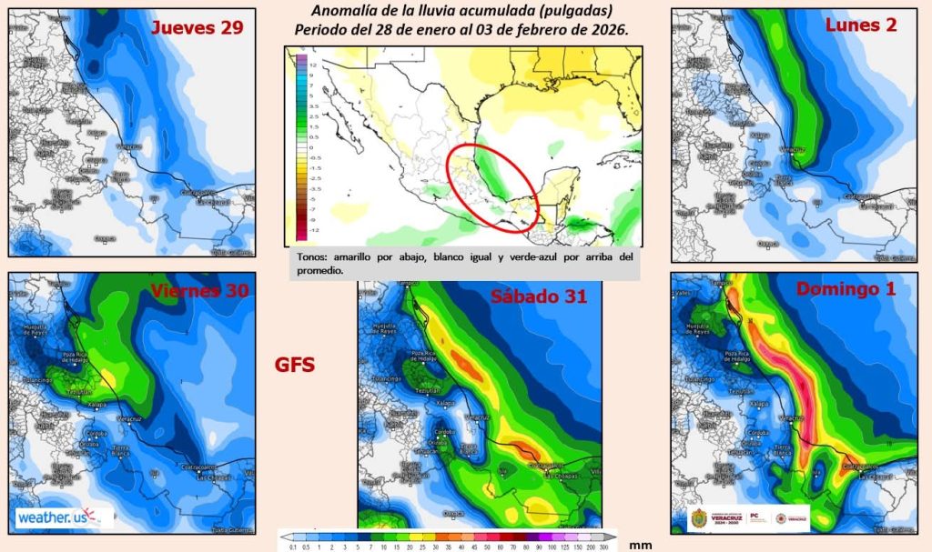 Pronostica PC-Veracruz próximo fin de semana lluvioso enero 28, 2026 FacebookTwitterWhatsAppTelegram Se espera que el potencial de lluvias moderadas a fuertes se incremente en el estado de Veracruz entre viernes 30 de enero al domingo 1 de febrero, informó la secretaría de Protección Civil del Gobierno del Estado de Veracruz.
