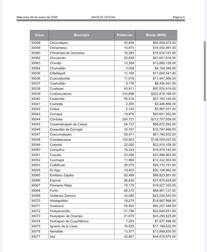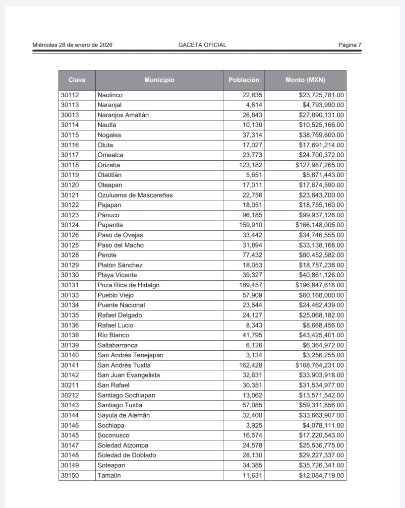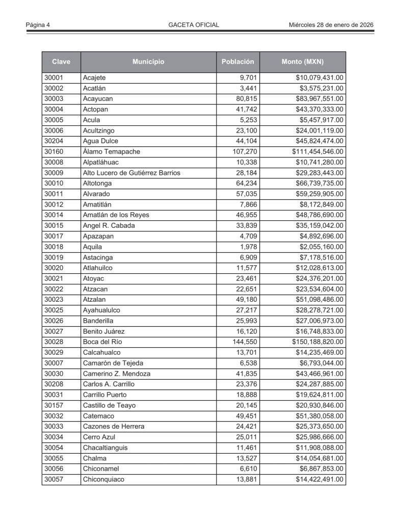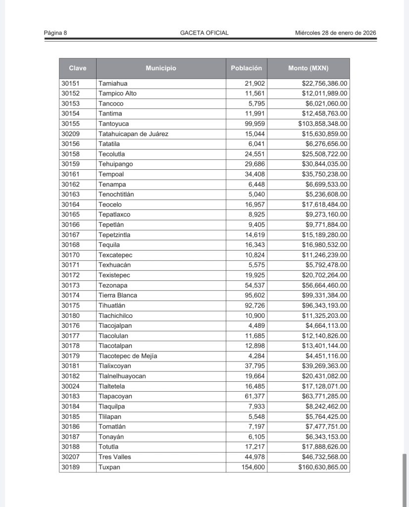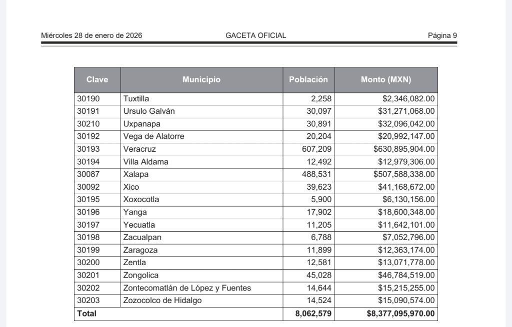 Este día fueron publicados los montos por municipios y en total para los 212 ayuntamientos, la cifra total para el ejercicio 2026, supera los 8 mil millones de pesos.