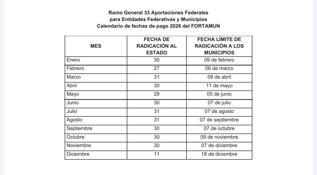 Según el acuerdo publicado este miércoles en la Gaceta Oficial del Estado, la fecha límite para que los ayuntamientos reciban la primera ministración de las participaciones federales, correspondiente al periodo de enero, será a más tardar el 9 de febrero de este año.