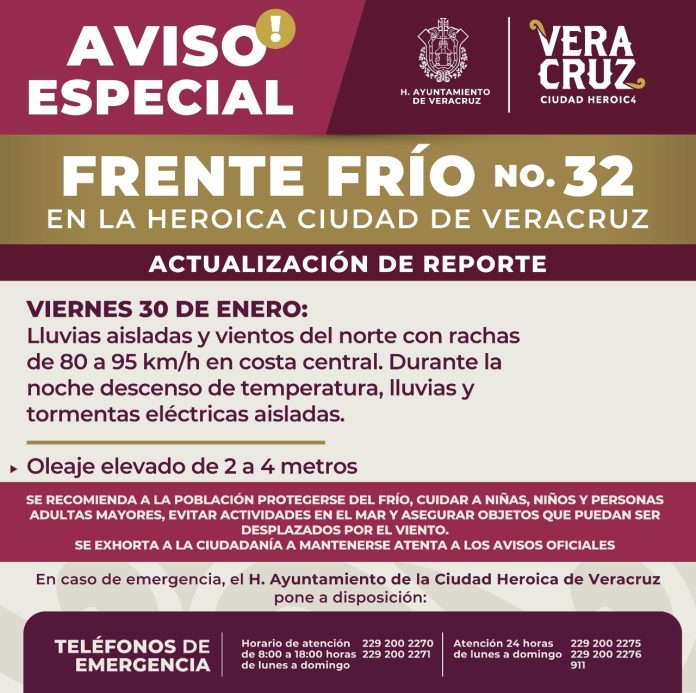 Con pronóstico de lluvias aisladas y vientos del norte con rachas de 80 a 95 km/h, el Frente Frío No. 32 ingresará a las costas de la ciudad de Veracruz la noche de este viernes, lo que ocasionará un nuevo descenso de temperatura, así como lluvias y tormentas eléctricas aisladas.