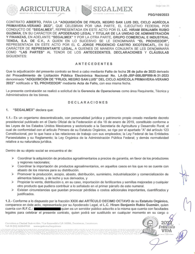 Pese a esos hallazgos, Segalmex volvió a contratar a la misma empresa. En un procedimiento distinto, cuyo fallo se emitió el 25 de julio de 2023, la dependencia adjudicó a Tenda el suministro de tres mil toneladas de frijol negro por 88 millones 300 mil pesos.