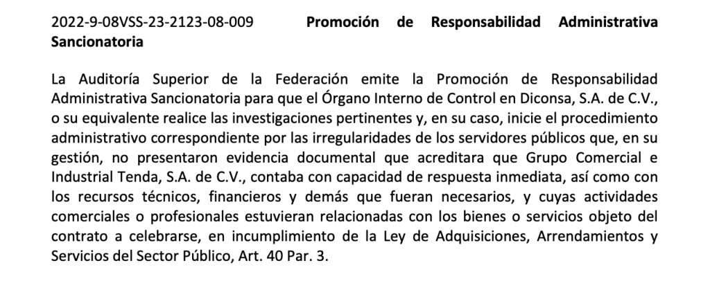 Durante la fiscalización de la Cuenta Pública 2022, la ASF determinó que Tenda no acreditó contar con capacidad de respuesta inmediata ni con los recursos técnicos, financieros y operativos necesarios, ni con antecedentes en la prestación de servicios de logística de granos. La revisión de su documentación legal y de sus operaciones bancarias mostró movimientos asociados a la comercialización de insumos de laboratorio y material médico, no a actividades relacionadas con el objeto del contrato celebrado con Segalmex, en contravención de los requisitos previstos en la ley de adquisiciones.