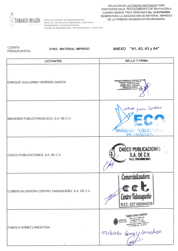En otra licitación, convocada por la Secretaría de Educación de Tabasco, fechada a inicios de agosto de 2019, la propia dependencia tabasqueña invitó directamente a las empresas Choco Publicaciones y Comercializadora Centro Tabasqueño, las cuales según sus propias facturas y contratos, están establecidas también en la calle Tres, número 214, colonia Reforma.