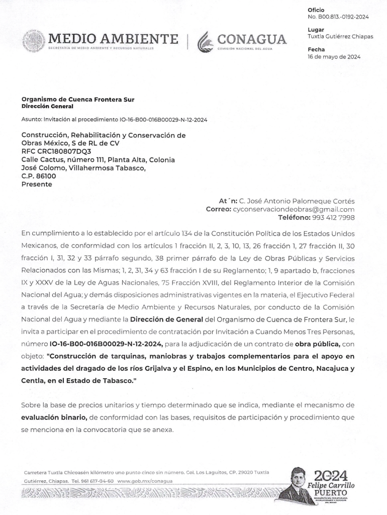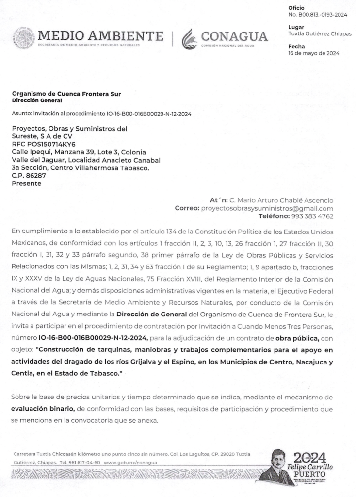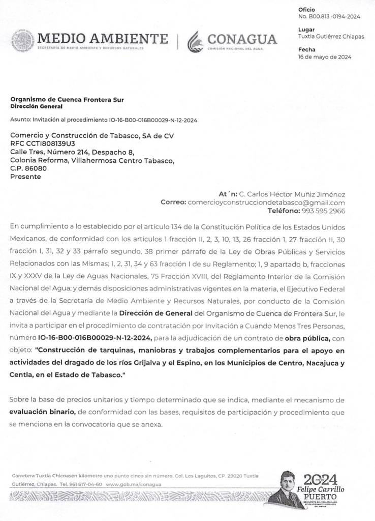 Por ejemplo, en un procedimiento del 16 de mayo de 2024 para actividades de limpieza de los ríos Grijalva y el Espino, la Comisión Nacional del Agua (Conagua) recibió ofertas de tres empresas vinculadas entre sí: Construcción, Rehabilitación y Conservación de Obras de México; Comercio y Construcción de Tabasco (empresa incluida por el SAT en su lista definitiva de factureras), y Proyectos, Obras y Suministros del Sureste.