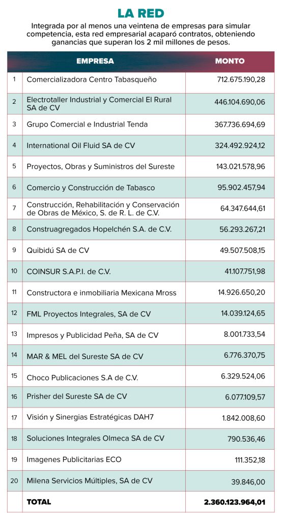 Esa práctica permitió la articulación de una red empresarial que simuló competencia para acaparar contratos. Algunas de las compañías se integraron en un entramado que creció durante el gobierno de Adán Augusto López en Tabasco y que después se extendió a por lo menos seis estados gobernados por Morena y al ámbito federal.
