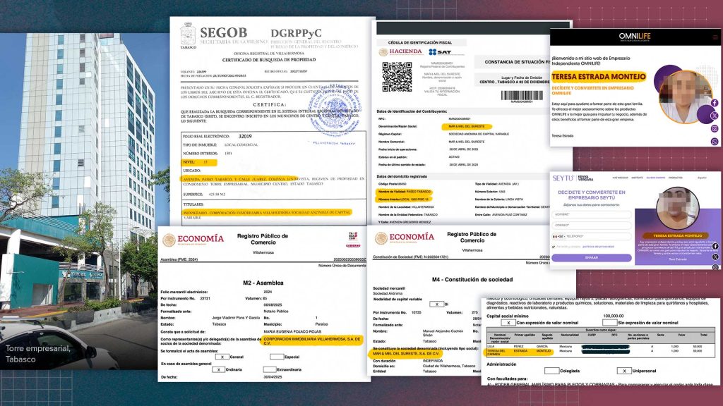El piso 15 de la más grande torre empresarial de Tabasco está escriturado a nombre de Corporación Inmobiliaria Villahermosa, una empresa en la que Adán Augusto López es copropietario. Justo en ese piso está el domicilio fiscal de Mar & Mel del Sureste, empresa que tiene como accionista y administradora única a una mujer que se gana la vida vendiendo productos nutricionales de Omnilife y cosméticos de la marca Seytú. La compañía ha obtenido contratos y subsidios por más de 4 millones de pesos en los gobiernos morenistas de Tabasco y Chiapas.