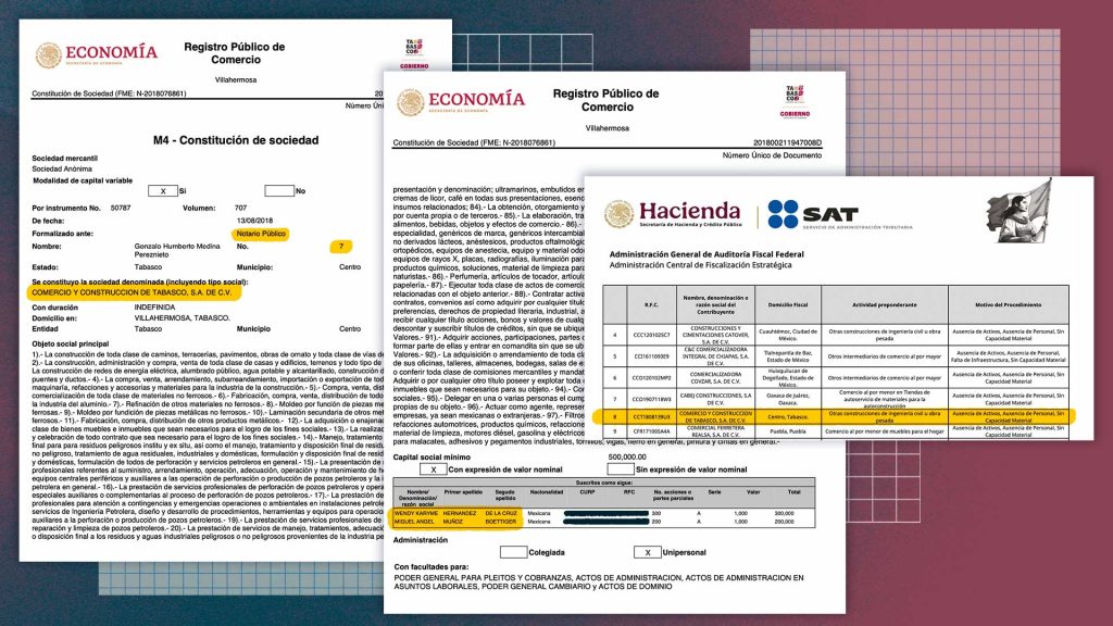 Comercio y Construcción de Tabasco fue constituida en 2018 por los accionistas Wendy Karyme Hernández de la Cruz y Miguel Ángel Muñoz Boettiger, ante la notaría 7 de Tabasco, asociada a la de Adán Augusto López. La empresa fue declarada oficialmente por el SAT como una simuladora de operaciones, mejor conocida como compañía “fantasma” o facturera.