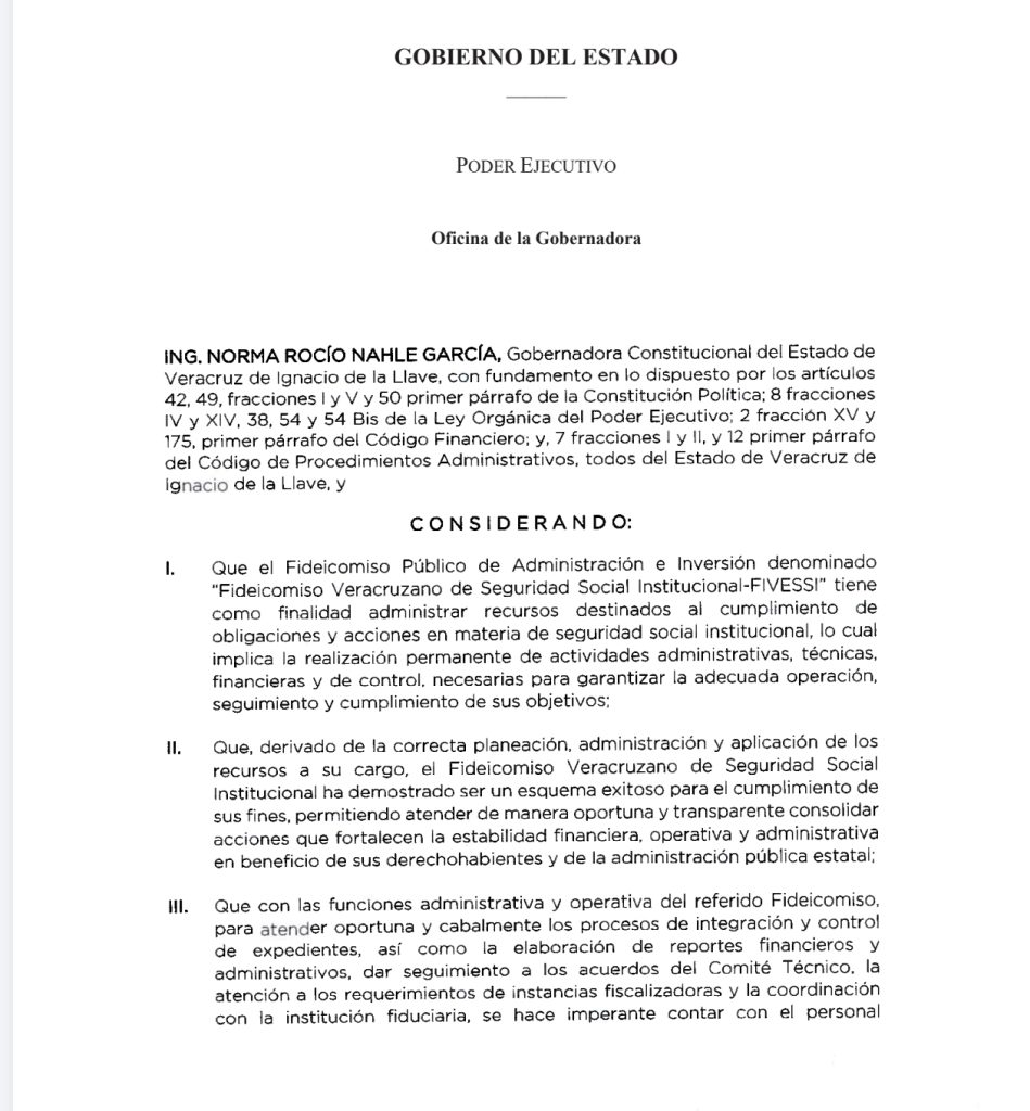 La gobernadora Rocío Nahle García creó dicho fideicomiso con el objetivo de garantizar recursos económicos para cubrir servicios de seguridad social a trabajadores del gobierno del estado de Veracruz.