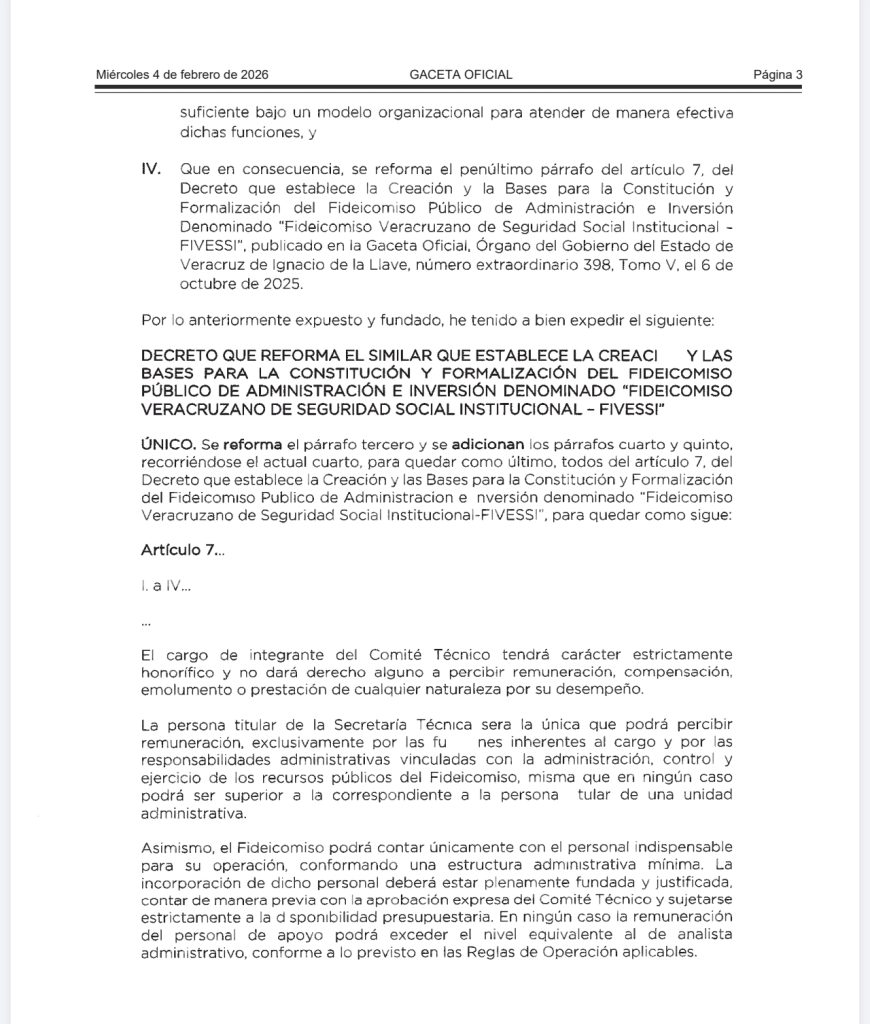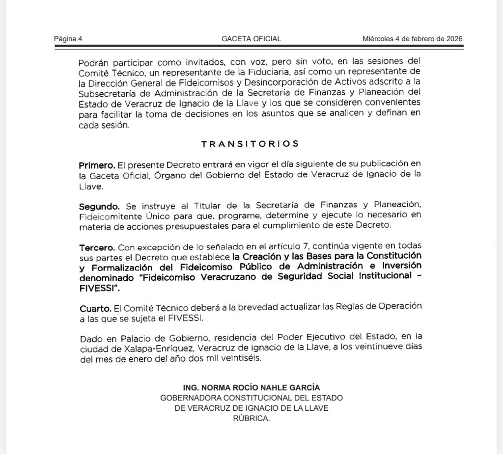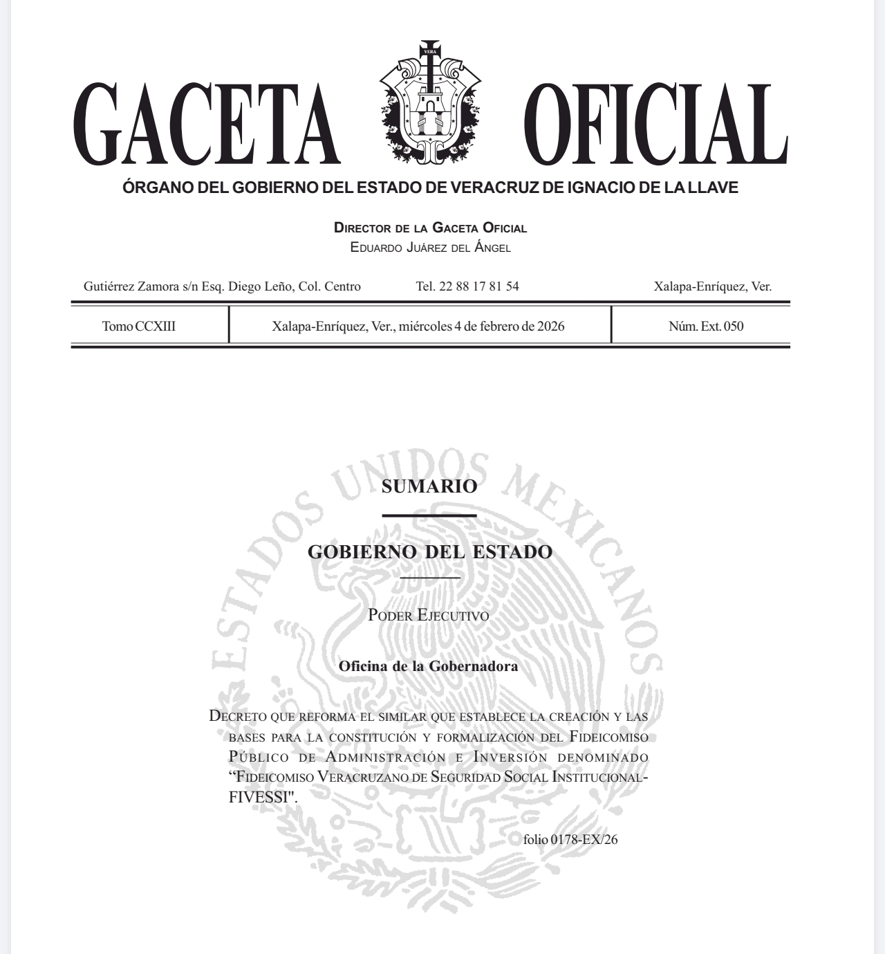Este miércoles 4 de febrero fue publicado en la Gaceta Oficial del Estado el decreto que reforma al recién creado Fideicomiso Veracruzano de Seguridad Social Institucional (FIVESSI).