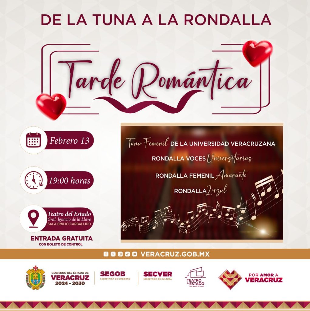 Xalapa, Ver. – En el marco del Día del Amor y la Amistad, este próximo viernes 13 de febrero, en la Sala Emilio Carballido del histórico Teatro del Estado, Gral. Ignacio de la Llave; la Secretaría de Cultura y la Secretaría de Gobierno ofrecen un concierto que promete encanto, ritmo y una atmosfera propia del mes más amoroso del año. Con cuatro destacadas agrupaciones de nuestro estado.
