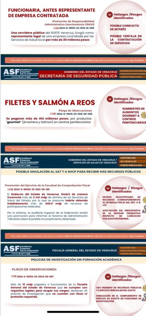 La ASF concluyó que los gastos no cumplen con los principios de racionalidad del gasto público, se presume que las facturas fueron infladas y que los insumos jamás llegaron a los Centros de Readaptación Social de Veracruz.