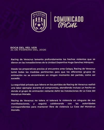 En el mismo boletín, la directiva de Racing considera que «la seguridad privada que labora en los partidos de Racing de Veracruz realizó una labor ejemplar durante el compromiso».