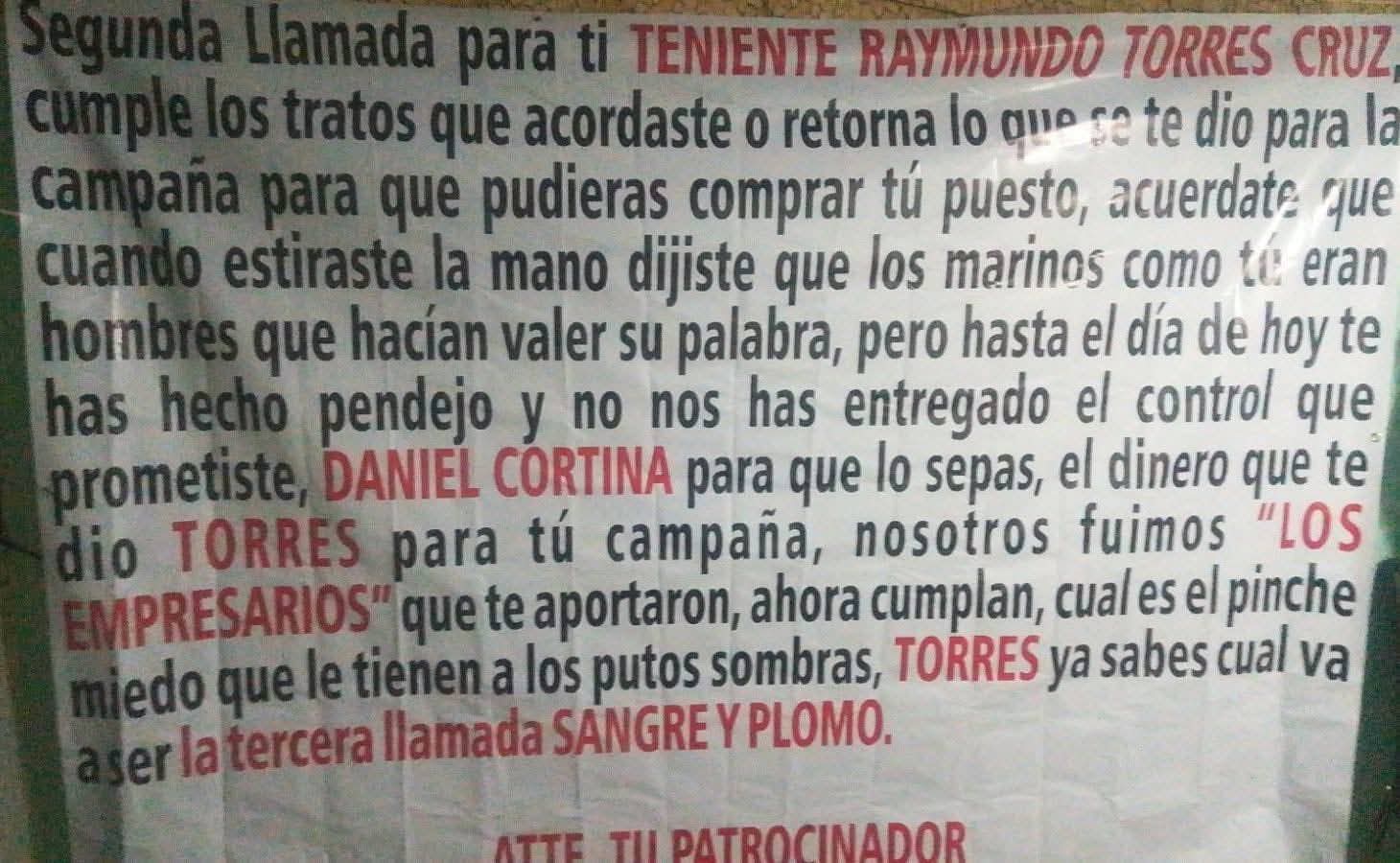 Se sabe que las lonas fueron firmadas por “Tu patrocinador”, dirigido al teniente Raymundo Torres Cruz, director de la Policía Municipal, a quien supuestamente piden “cumplir acuerdos” por supuestas aportaciones económicas que habrían hecho llegar a la campaña del ahora alcalde Daniel Cortina.