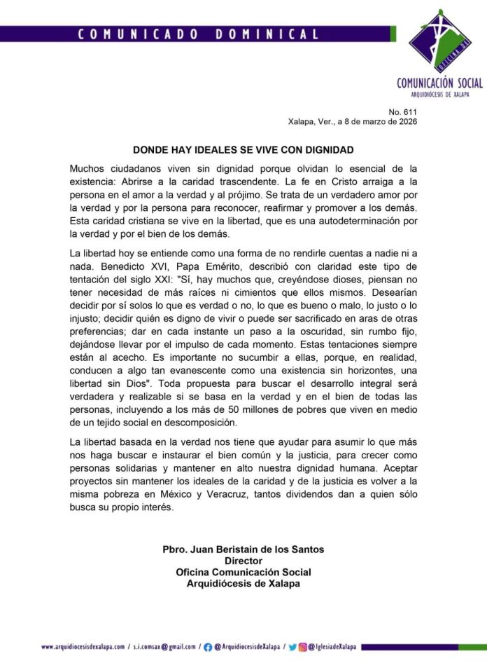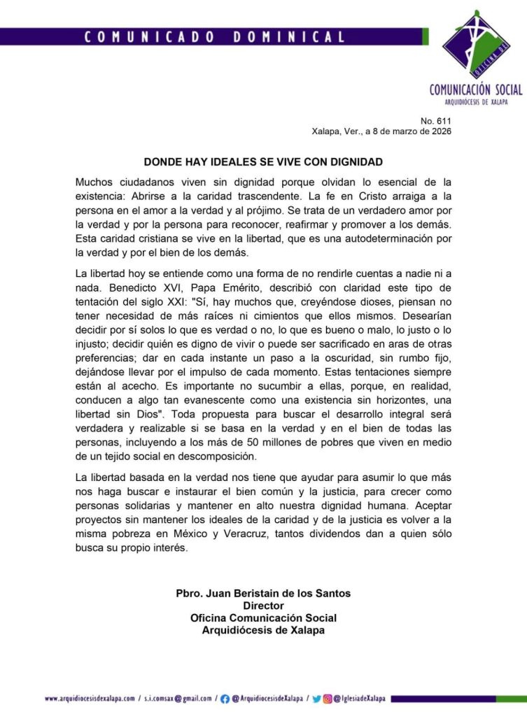 Donde hay ideales, se vive con dignidad: Arquidiócesis de Xalapa marzo 8, 2026 FacebookTwitterWhatsAppTelegram